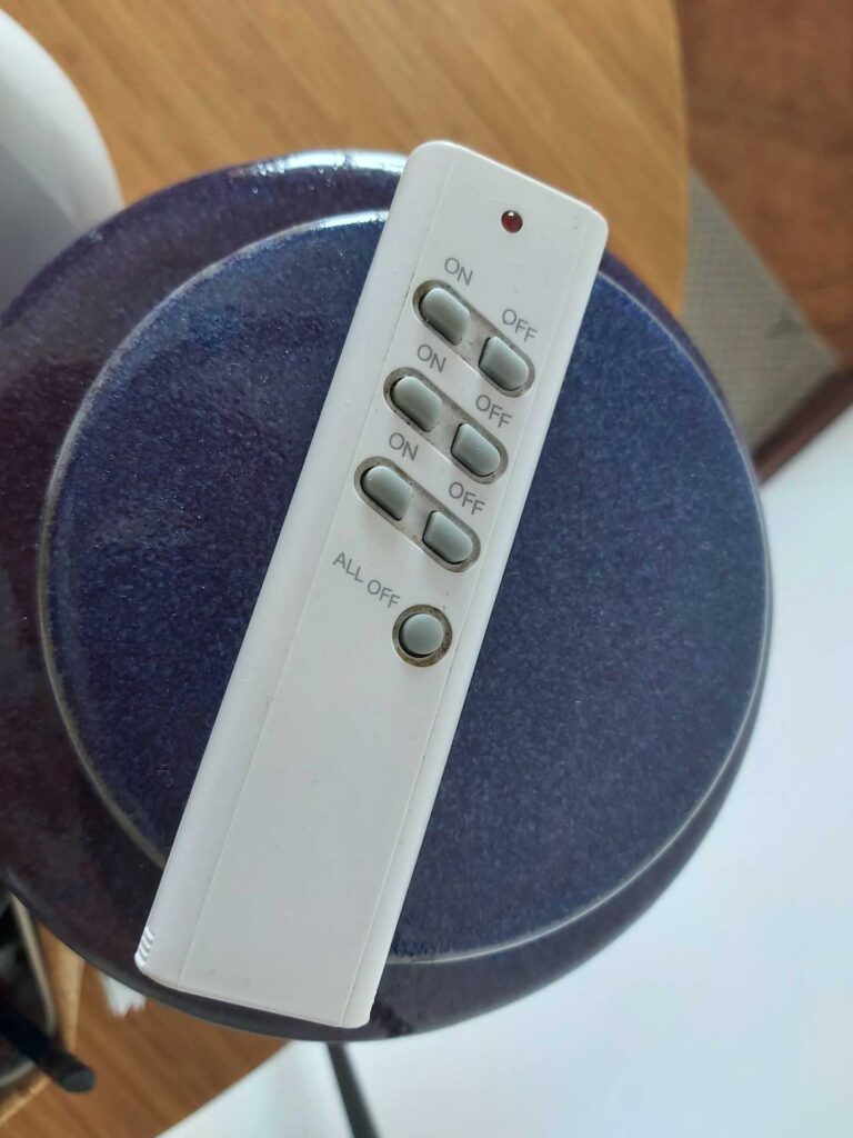 Alle lichten in de woonkamer gaan aan/uit met één afstandsbediening. Die ligt op de tafel.