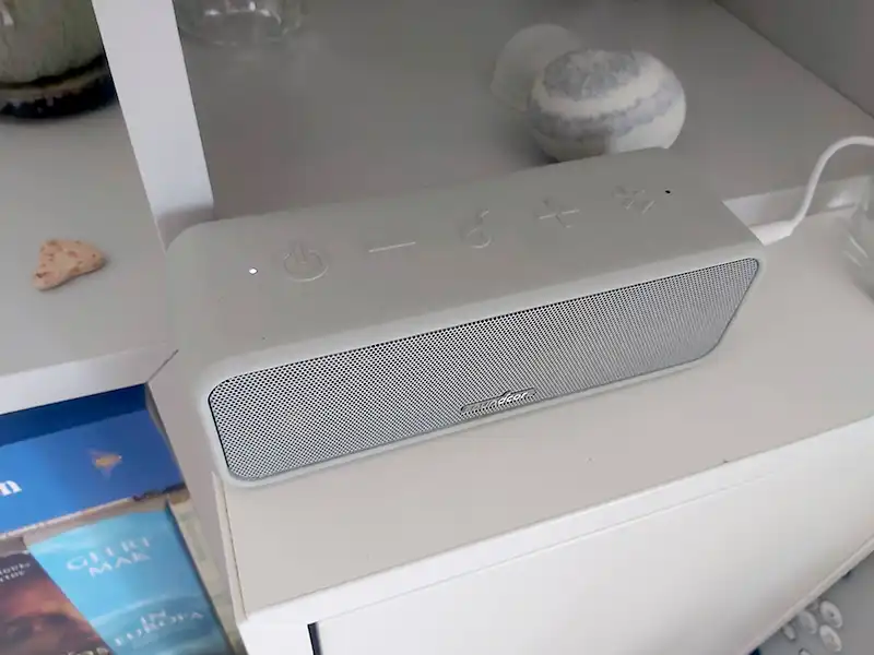 Zet je BlueTooth aan en verbind met SoundCore3. Druk de eerste keer op het knopje met het BlueTooth symbool om je telefoon te koppelen aan de speaker. Daarna vindt-ie ‘m vanzelf.